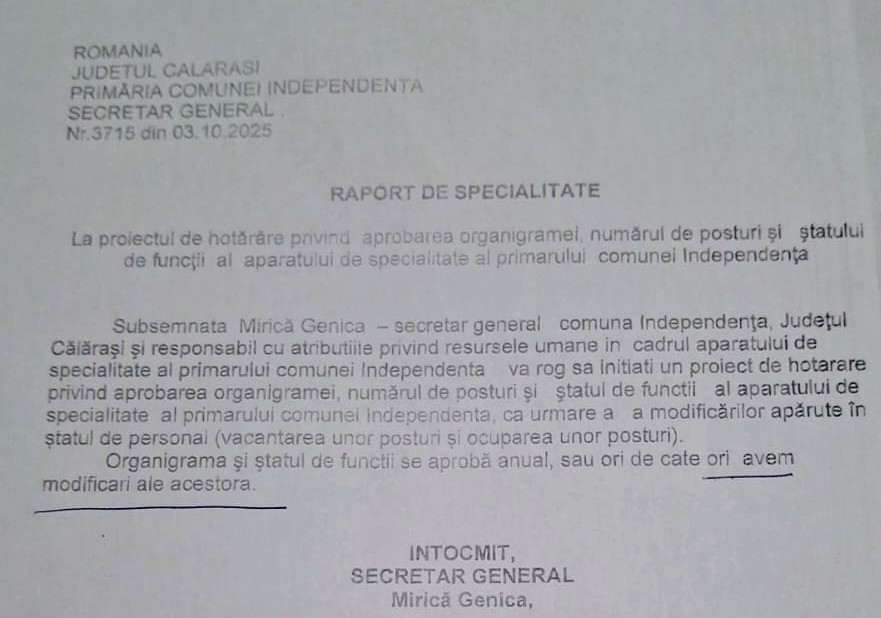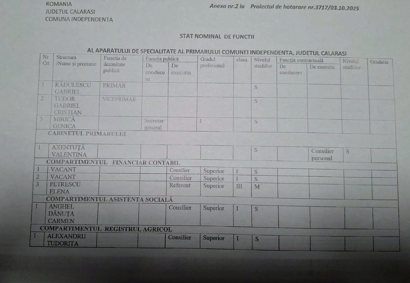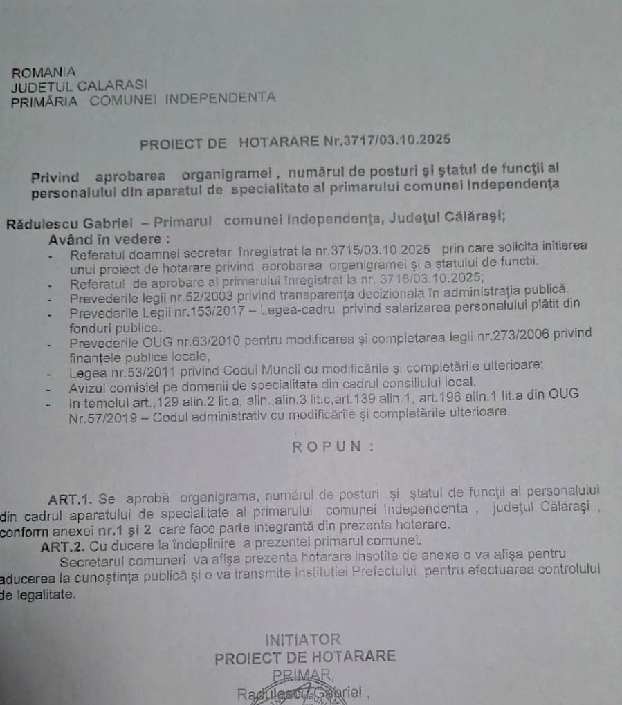 Numai că, potrivit actelor consultate de Ediția, la data de 3 octombrie 2025, edilul a semnat Proiectul de Hotărâre nr. 3717/03.10.2025, privind aprobarea noii organigrame și a statului de funcții al personalului din aparatul propriu.