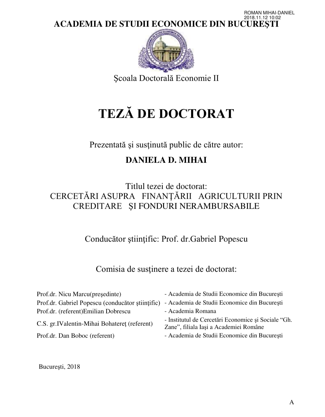 Teza analizată se intitulează „Cercetări asupra finanțării agriculturii prin creditare și fonduri nerambursabile”. Evaluarea se concentrează pe un criteriu esențial al oricărei lucrări doctorale: raportul dintre bibliografie, utilizarea efectivă a surselor și aportul propriu al autorului.