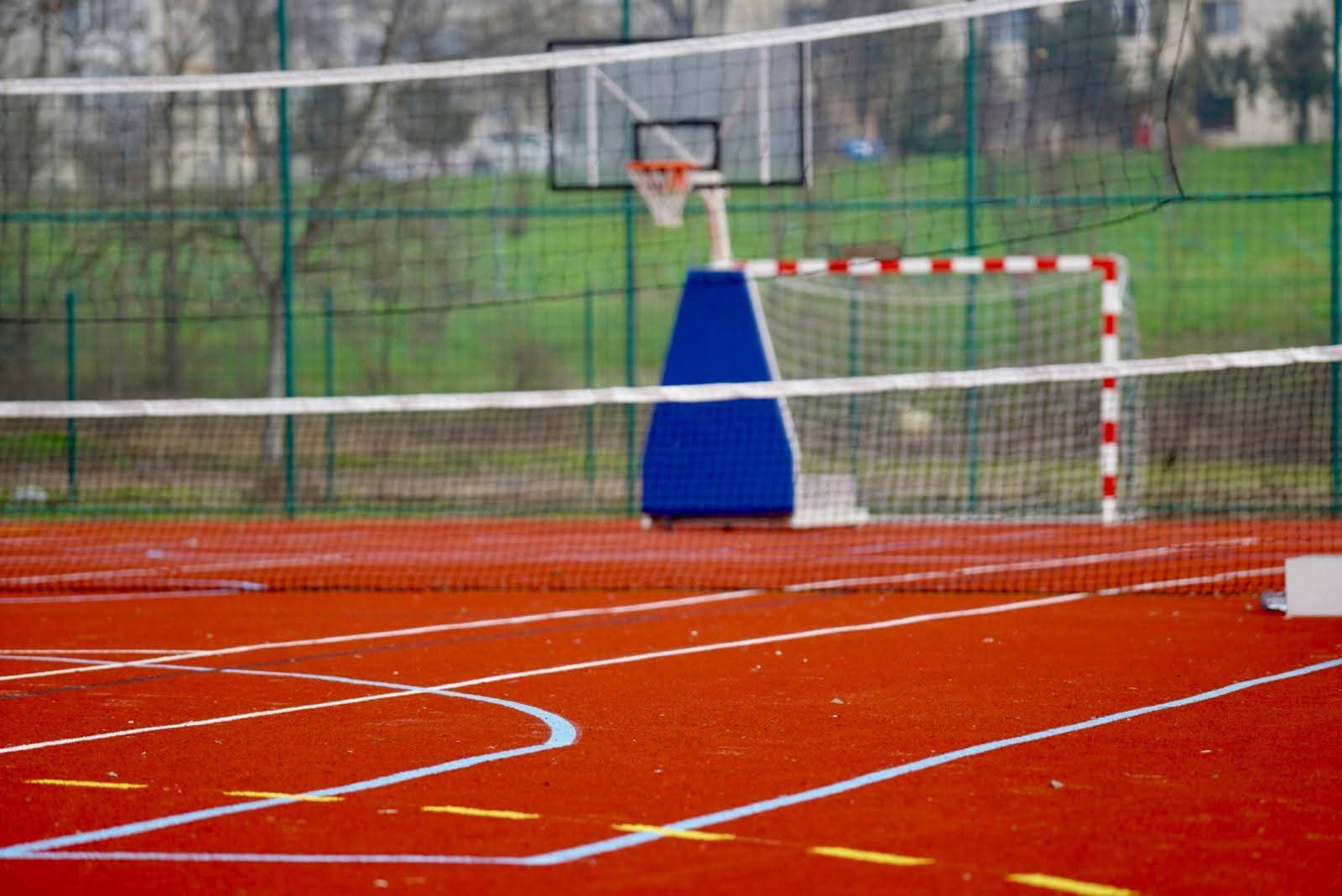 teren multifuncțional pentru handbal, baschet, volei și tenis, cu suprafață tip tartan;