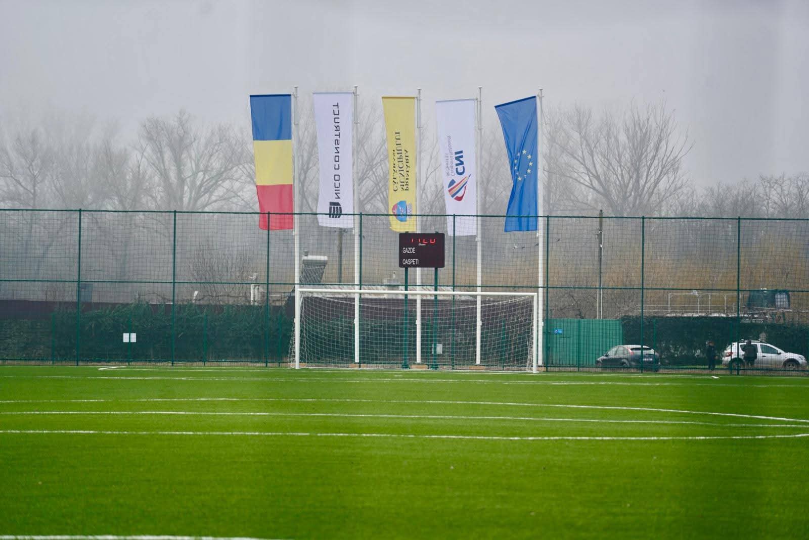 teren de fotbal omologat, cu dimensiuni de 105 x 68 m, gazon artificial și instalație de nocturnă;