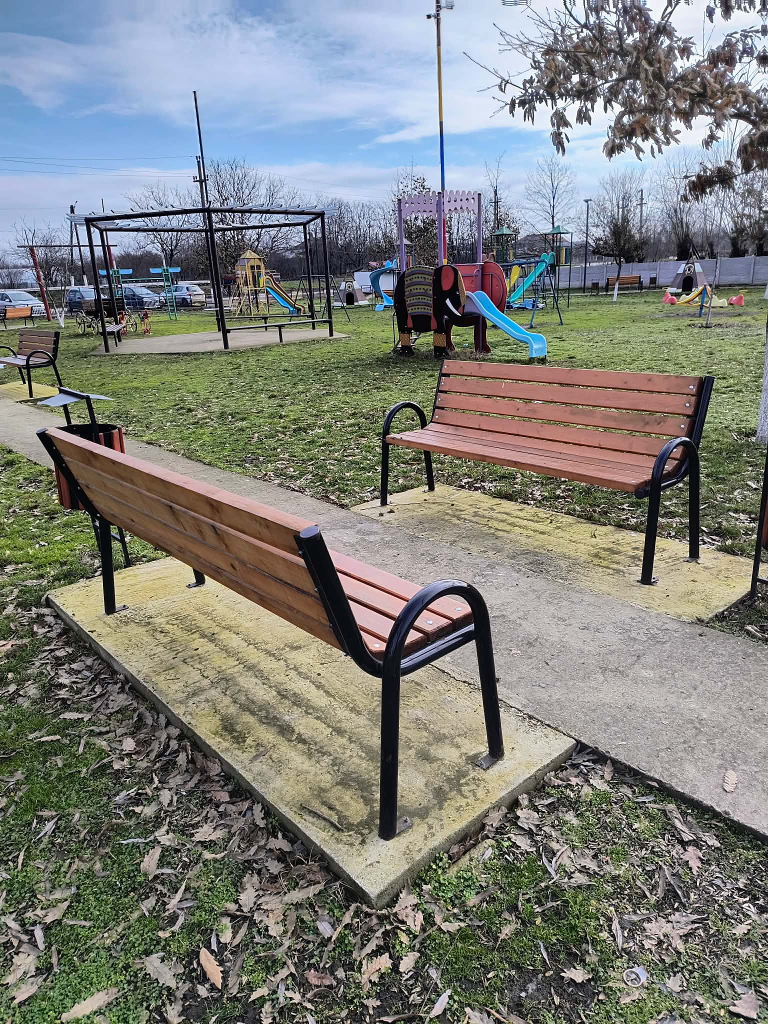 Părăsim clădirea și mergem în centrul comunei Vasilați, parcul este tixit de băncuțe noi.