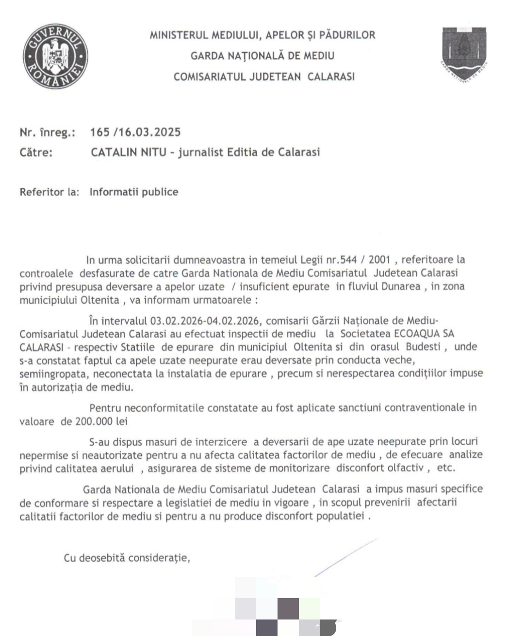 Publicația Ediția a solicitat puncte de vedere oficiale, în baza Legea nr. 544/2001, privind măsurile dispuse la nivelul conducerii ECOAQUA SA, precum și din partea Consiliul Județean Călărași.