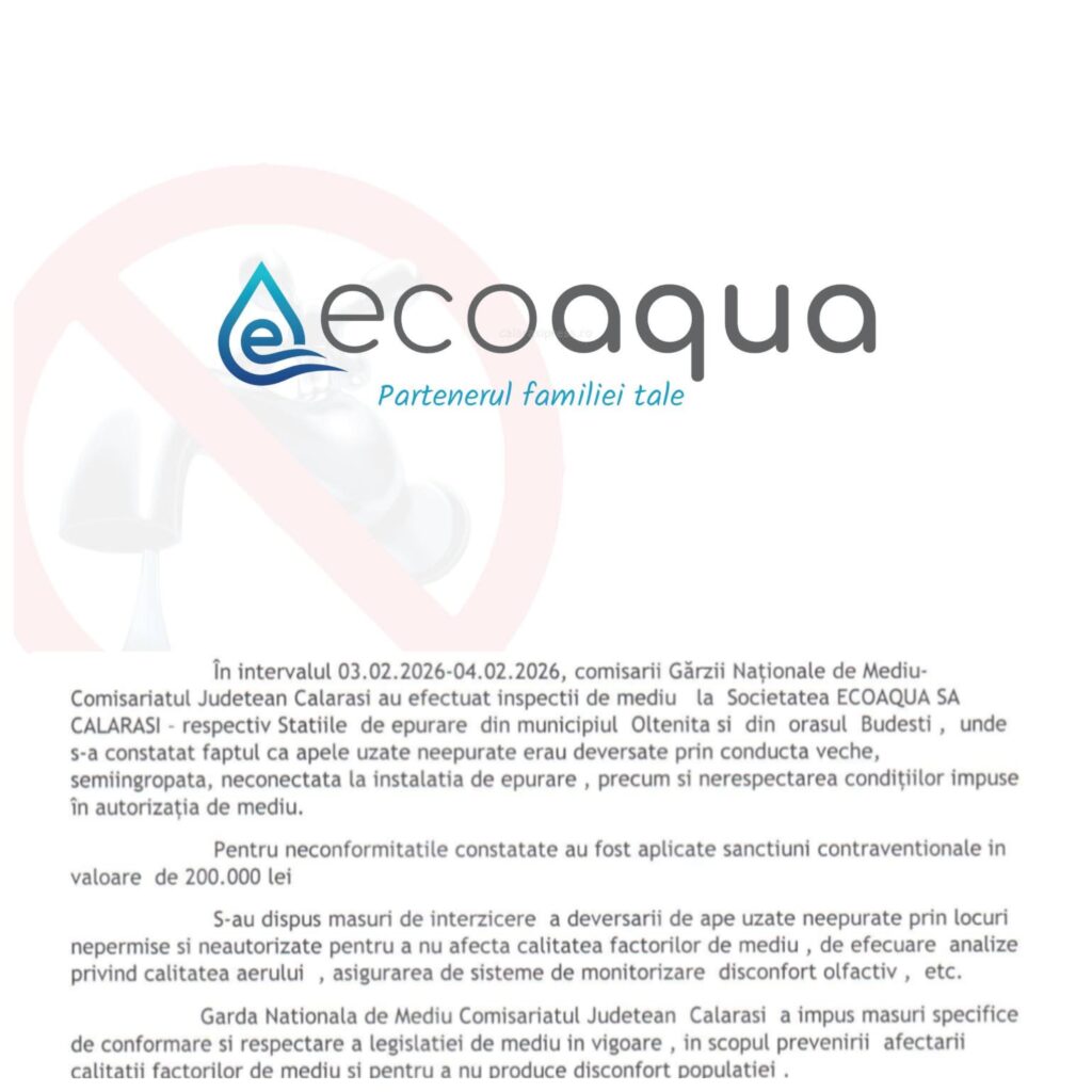 Controalele efectuate în perioada 3–4 februarie 2026 la stațiile de epurare din Oltenița și Budești au scos la iveală o situație gravă: apele uzate erau evacuate printr-o conductă veche, semiîngropată și neconectată la sistemul de epurare. Practic, poluarea avea loc în afara cadrului legal, cu încălcarea directă a autorizației de mediu.