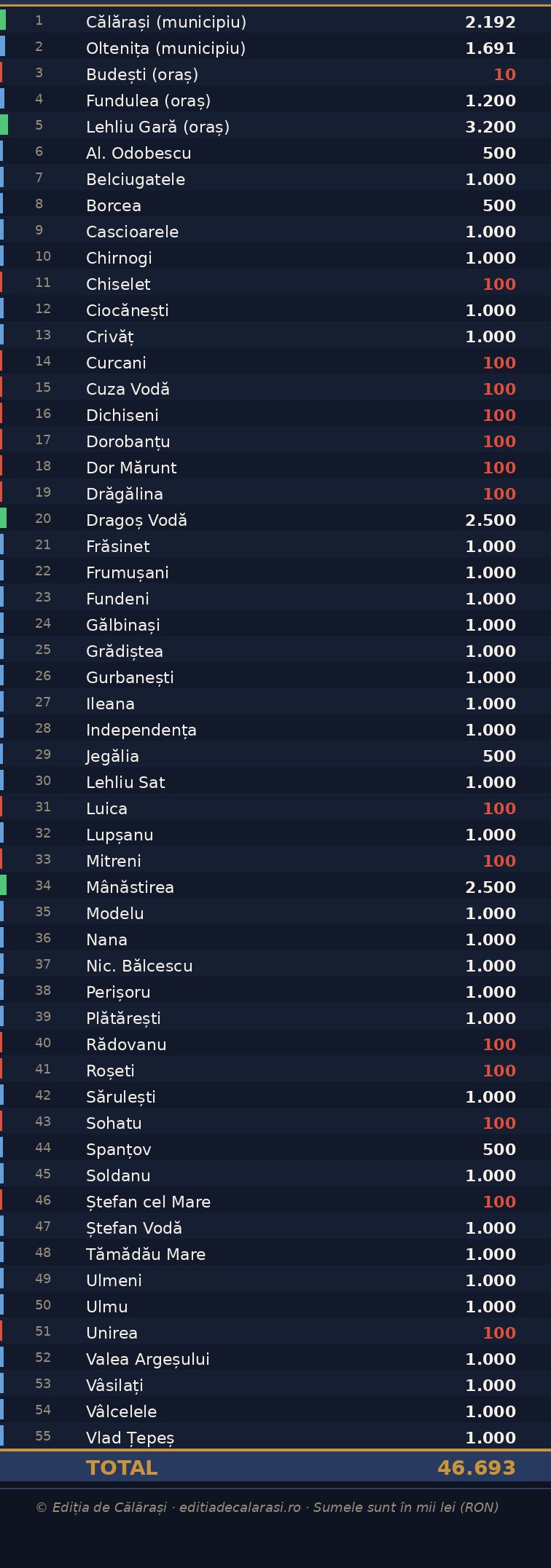 Orașul Budești – cu statut de oraș – figurează în document cu suma simbolică de 10.000 lei, în vreme ce comuna Fundulea beneficiază de 1.200.000 lei, de 120 de ori mai mult. Municipiul Călărași primește 2.192.000 lei, iar Oltenița – al doilea municipiu al județului – 1.691.000 lei.